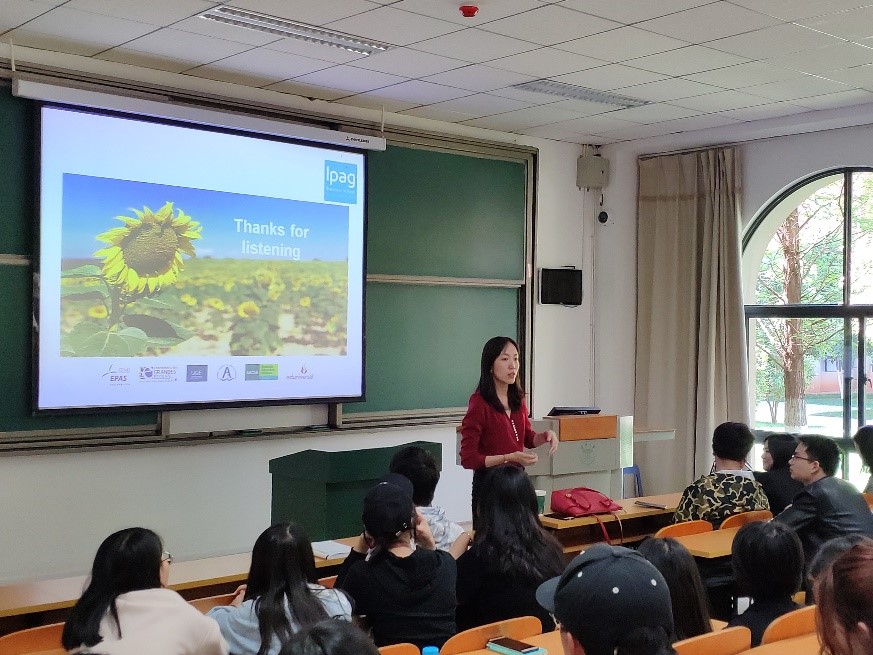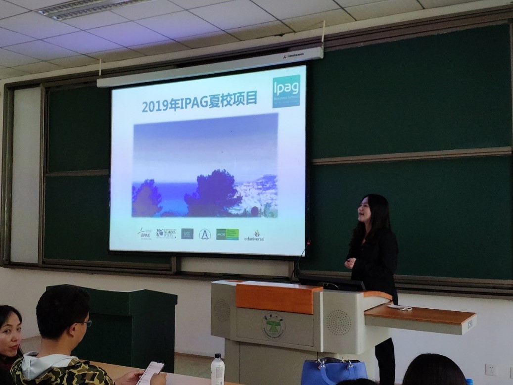 随后,来自法国IPAG商学院的倪老师对万象城官网IPAG志愿者同学所进行的各项活动表示了感谢,并对法国与IPAG商学院的整体情况做了介绍。倪老师图文并茂地为同学们描绘了在法国生活学习的图景,详细地说明了IPAG夏校特色课程和日程安排,最后对同学们关心的生活学习费用等问题做了细致地解释。