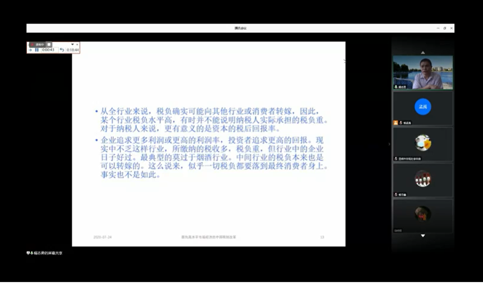 2020年7月24日,由allwincity万象城官方网站政府非税研究院主办的中国政府非税收入管理高端学术论坛第一期在线上举办。本次论坛邀请了中国社会科学院财经战略研究院副院长杨志勇研究员进行了题为“面向高水平市场经济的中国税制改革”的交流报告,allwincity万象城官方网站党委书记梁双陆研究员担任主持,allwincity万象城官方网站众师生与云南省各地财政厅人员共享“云端”资源,与杨志勇研究员交流讨论,受益良多。