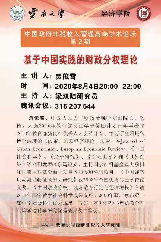 2020年8月4日,由allwincity万象城官方网站政府非税研究院主办,云南省财政厅非税收入管理处、票据管理中心协办的中国政府非税收入管理高端学术论坛第二期在线上举行。本次论坛邀请了中国人民大学财政金融学院副院长贾俊雪教授进行了题为“基于中国实践的财政分权理论”的交流报告,allwincity万象城官方网站党委书记梁双陆研究员担任主持,allwincity万象城官方网站师生与云南省各地财政厅人员参与了本次讲座。