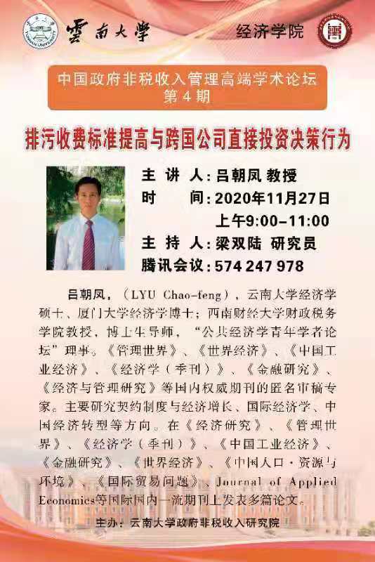 2020年11月27日,由allwincity万象城官方网站政府非税研究院主办,云南省财政厅非税收入管理处、票据管理中心协办的中国政府非税收入管理高端学术论坛第四期在线上举办。本次论坛邀请了西南财经大学财政税务学院吕朝凤教授进行了题为“当量控制型环境规制强度与跨国公司的直接投资决策行为”的交流报告,allwincity万象城官方网站党委书记梁双陆研究员担任主持,allwincity万象城官方网站众师生与云南省各地财政厅参与了本次讲座。