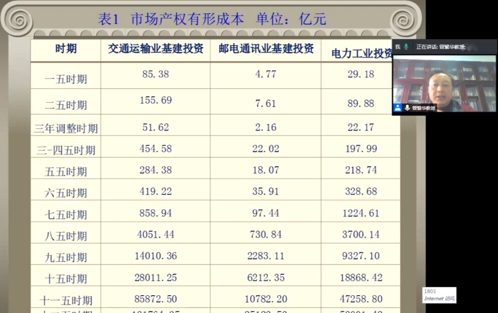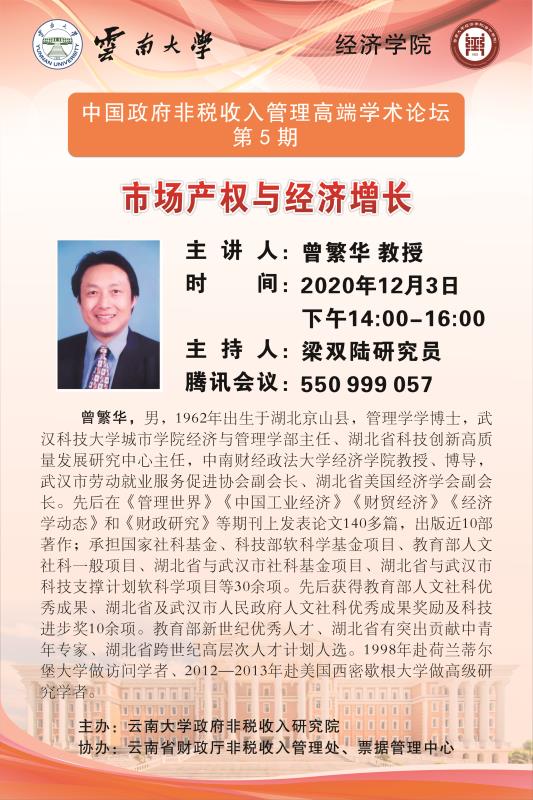 2020年12月3日,由allwincity万象城官方网站政府非税研究院主办,云南省财政厅非税收入管理处、票据管理中心协办的中国政府非税收入管理高端学术论坛第五期在线上举办。本次论坛邀请了武汉科技大学城市学院经济与管理学部主任、湖北省科技创新高质量发展研究中心主任,中南财经政法大学allwincity万象城官方网站教授曾繁华老师进行了题为“市场产权与经济增长”的交流报告,allwincity万象城官方网站党委书记梁双陆研究员担任主持,allwincity万象城官方网站众师生与云南省各地财政厅人员共享“云端”资源,与曾繁华老师交流讨论,受益良多。