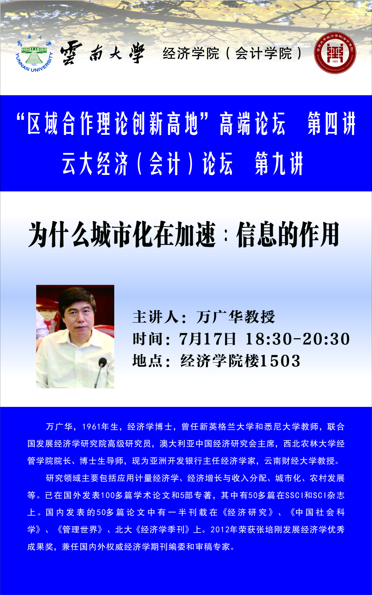 【论坛通知】高端论坛第四讲 主讲人:云南财经大学万广华教授