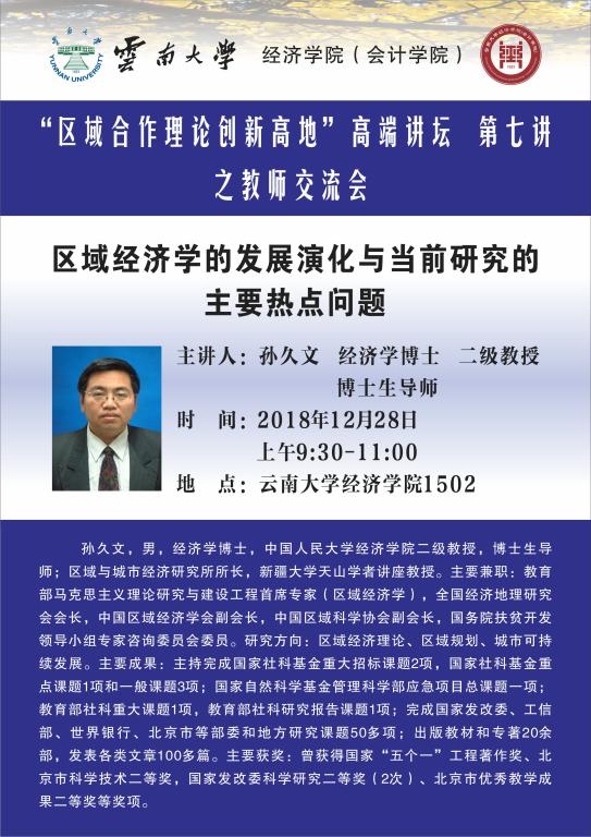 【论坛通知】高端论坛第七讲 主讲人:中国人民大学孙久文教授