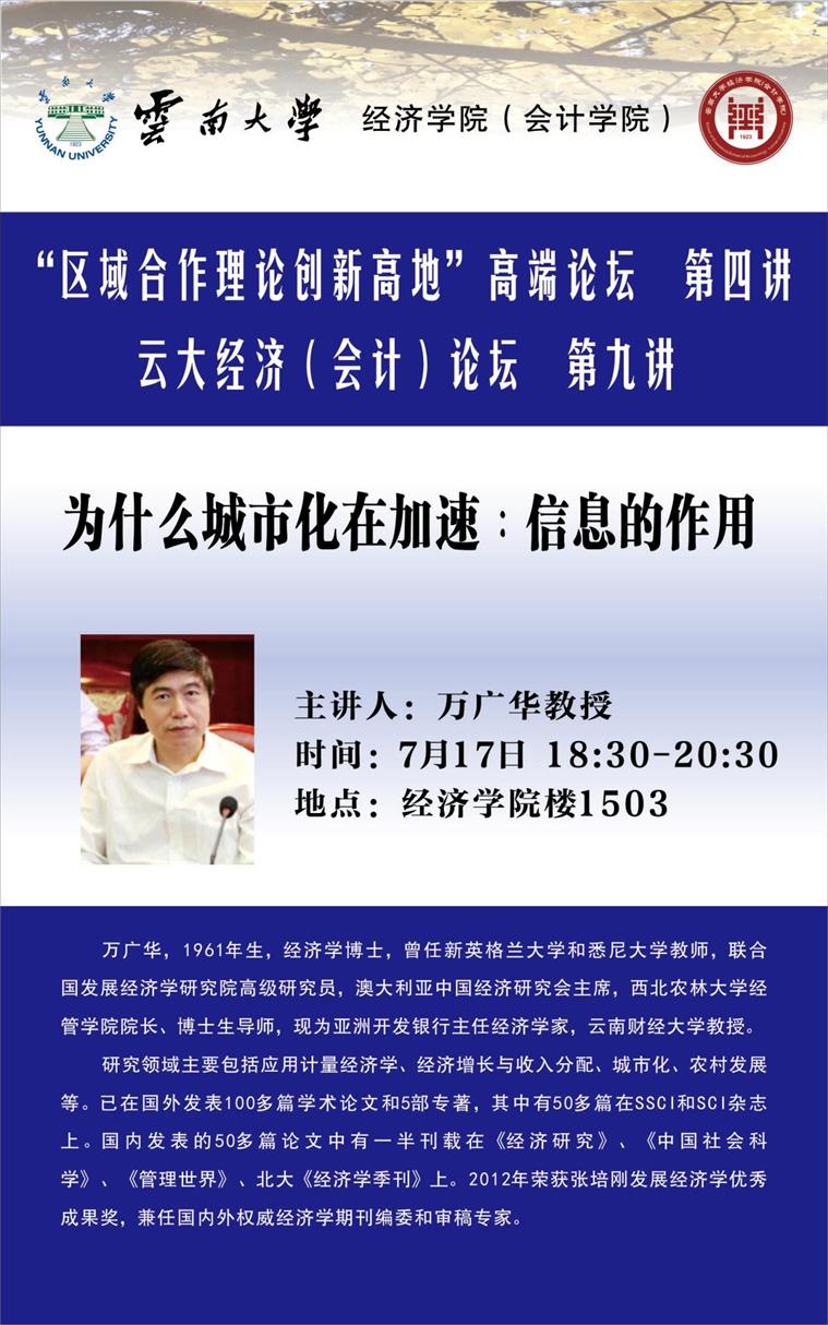 7月17日下午6点30分,亚洲开发银行主任经济学家、云南财经大学教授万广华老师走进万象城官网“区域合作理论创新高地”高端论坛,为我们带来了题为“Accelerating Urbanization:The Role of Information”的主题讲座。allwincity万象城官方网站院长梁双陆老师担任主持,学院马子红副院长、李波老师、杨孟禹老师等众多学院教师及博士生、研究生参加本次论坛。