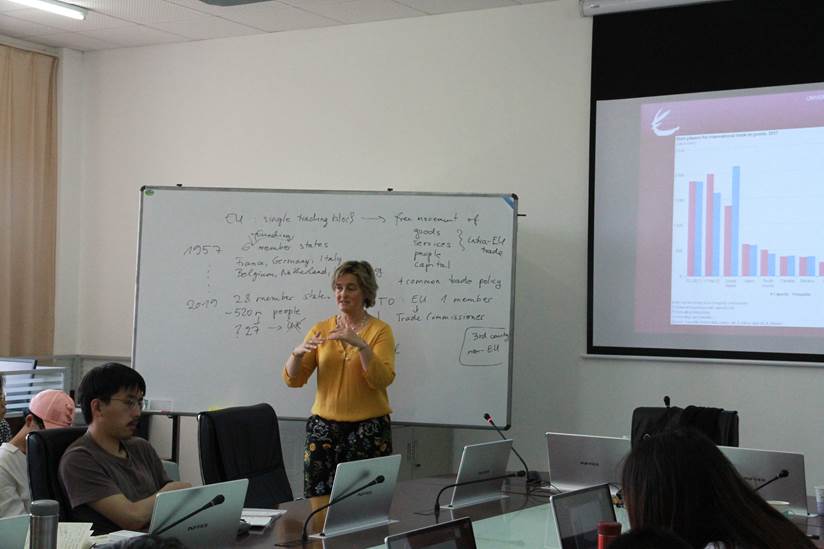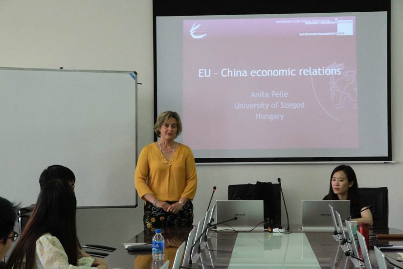 Anita Pelle教授的讲座围绕中欧经贸合作关系展开。讲座开始,Pelle教授简要介绍了欧盟的贸易政策。欧盟以贸易协定的形式管理与第三国的经贸关系,以创造更好的交易机会,克服合作障碍。欧盟的贸易政策也被用来促进欧洲的价值观念形成,从民主和人权到环境和社会权利。并强调,2018年6月在世界贸易紧张局势加剧的背景下,欧洲理事会维护和深化多边体系,欧盟表示愿意与志同道合的伙伴一道改善世贸组织的运作。