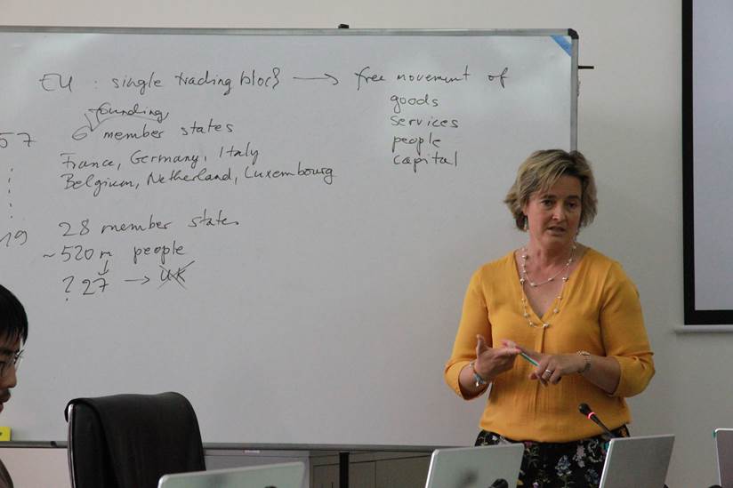 紧扣时事,Pelle教授在主题讲座之后为在场教师、同学分享了自己关于英国脱欧的看法。她首先从经济体量、购买力平价、货币储备等方面分析欧盟在世界经济中的地位,揭示欧盟贸易基本平衡的态势。进一步阐述英国在欧盟中的作用及英国公投脱欧的背景,说明英国脱欧对其本身、欧盟及美国的影响。