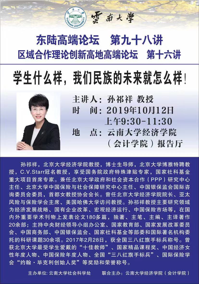 【论坛通知】高端论坛第十六讲 主讲人:北京大学孙祁祥教授