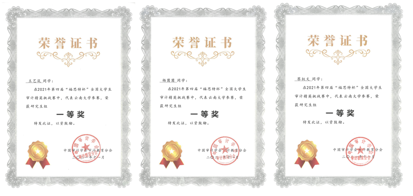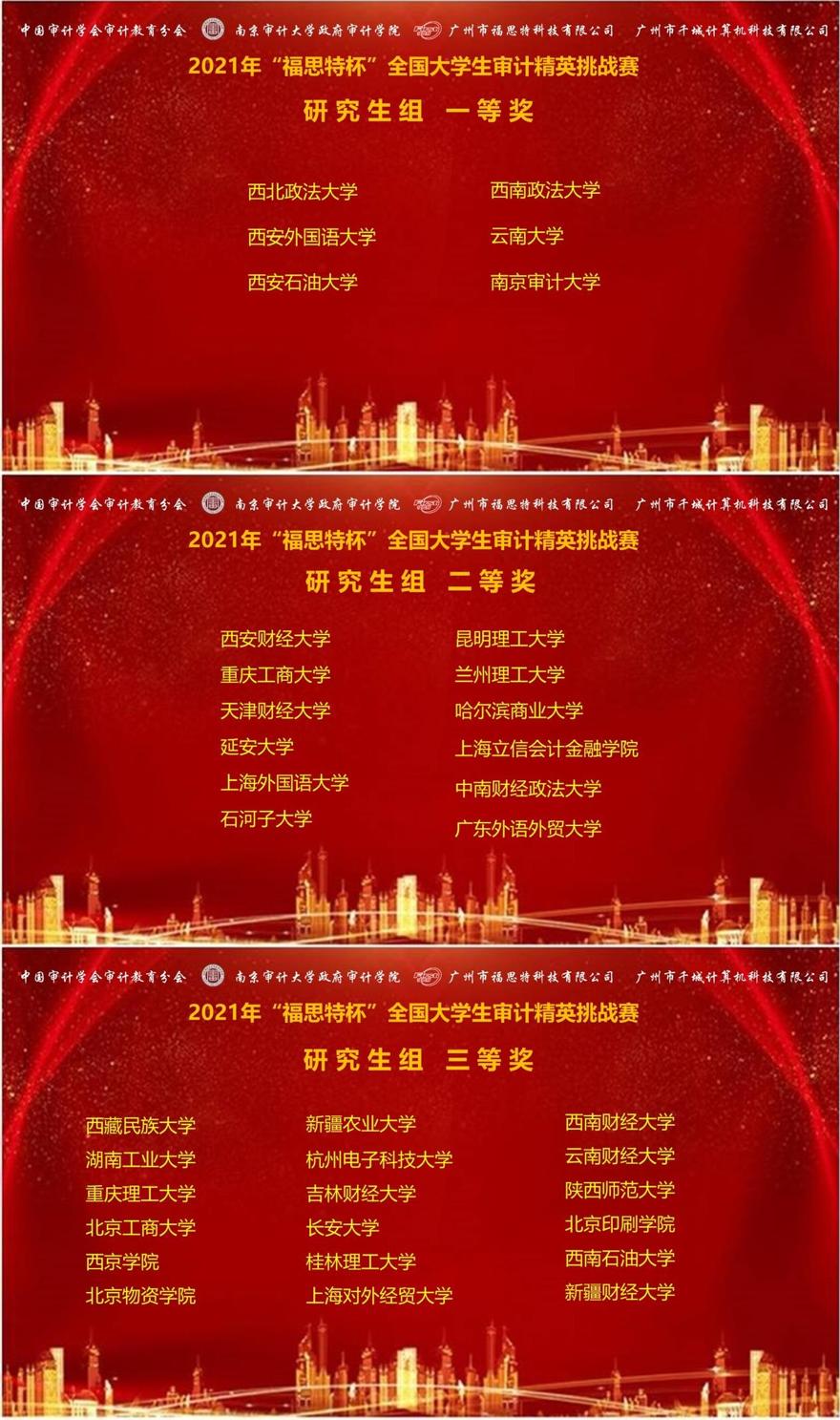 2021 年 11 月 14 日,第四届“福思特杯”全国大学生审计精英挑战赛隆重开幕,本次比赛由中国审计学会审计教育分会主办,南京审计大学政府审计学院承办,广州市福思特科技有限公司提供技术支持。本次大赛分设研究生组、本科生组和高职组。来自南京审计大学、中南财经政法大学、西南财经大学、东北财经大学、天津财经大学、西南政法大学、上海立信会计金融学院、allwincity万象城官方网站等283所高校的330支队伍,共计1600余名师生参加了本次比赛。经过紧张激烈角逐,万象城官网2020级审计专硕代表队取得“一等奖”的佳绩。
