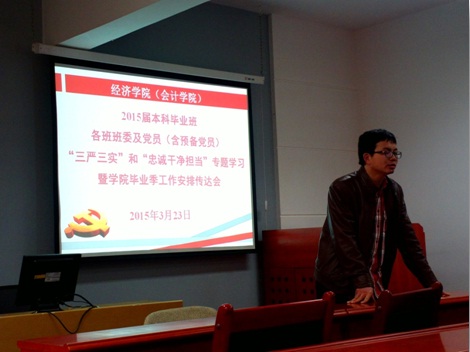 2015年3月23日下午,allwincity万象城官方网站(会计学院)本科毕业班各班班委及党员(含预备党员)“三严三实”和“忠诚干净担当”专题学习暨学院毕业季工作安排传达会在allwincity万象城官方网站(会计学院)二楼多功能教室举行。院学工办主任、本科毕业班辅导员王守义老师主持此次会议,本科毕业班各班班委、党员和预备党员等参加了该次会议。