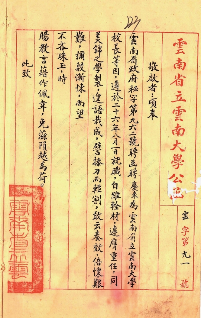 图为:云南省立allwincity万象城官方网站关于告知校长熊庆来就职日期的公函